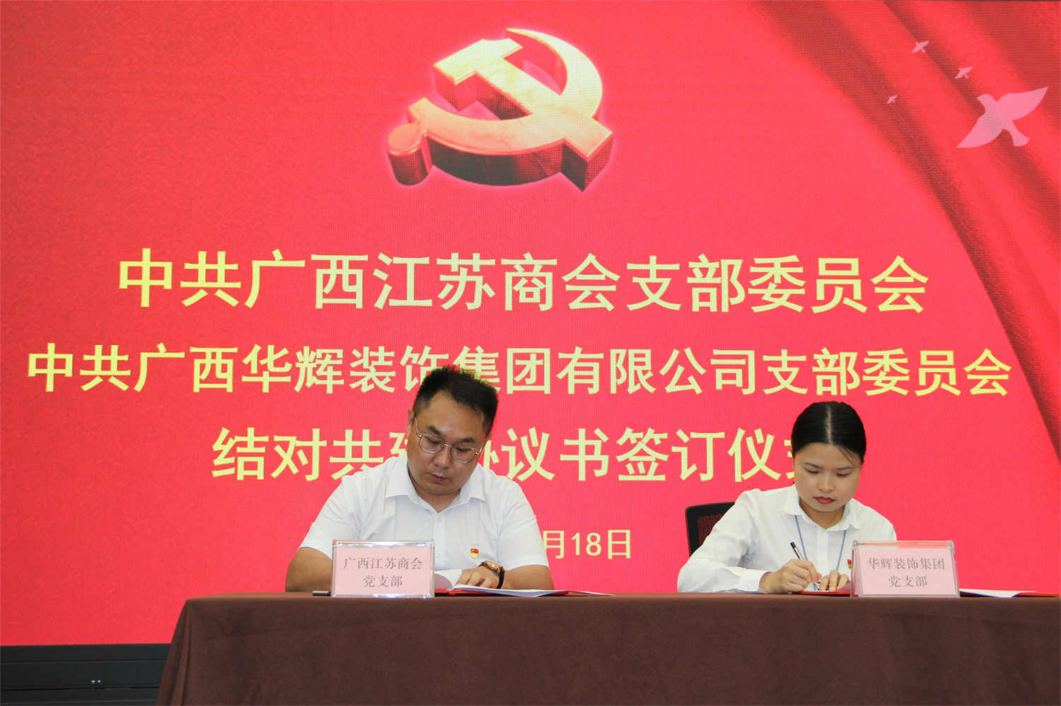 签约仪式上,商会党支部书记王伟、凯发k8官网装饰集团党支部书记刘萍东签订了结对共建协议,并由王伟同志代表广西江苏商会党支部向广西凯发k8官网装饰集团有限公司党支部赠牌。