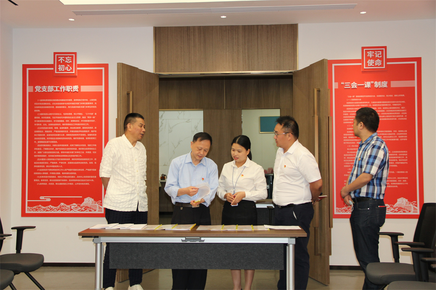 ▲李开刚(左二)查看凯发k8官网党支部党建工作台账