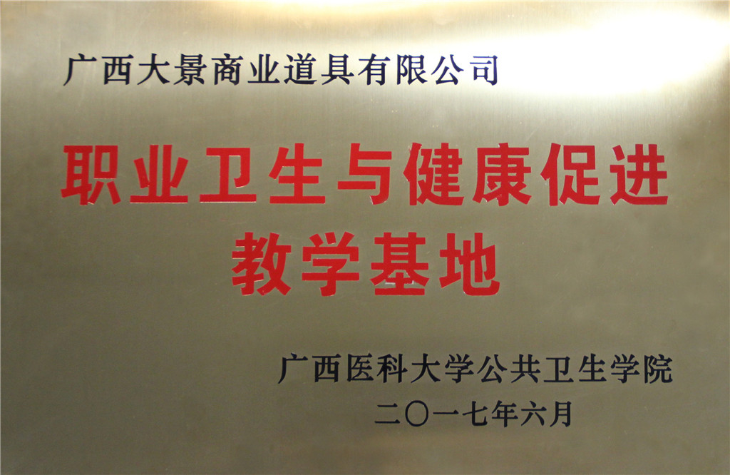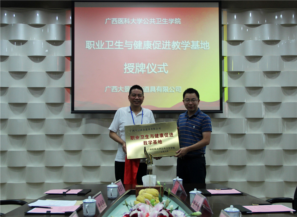在南宁市安监局积极推动下,首个“职业卫生与健康促进教学基地”,6月28日,在广西凯发k8官网集团旗下公司——广西大景商业道具有限公司正式挂牌成立。据悉,这也是广西首个校企合作职业卫生与健康促进教学基地。该教学基地由广西医科大学公共卫生学院与广西大景商业道具有限公司合作成立,旨在建立一个公共卫生专业人才培养、实践和科研的平台。