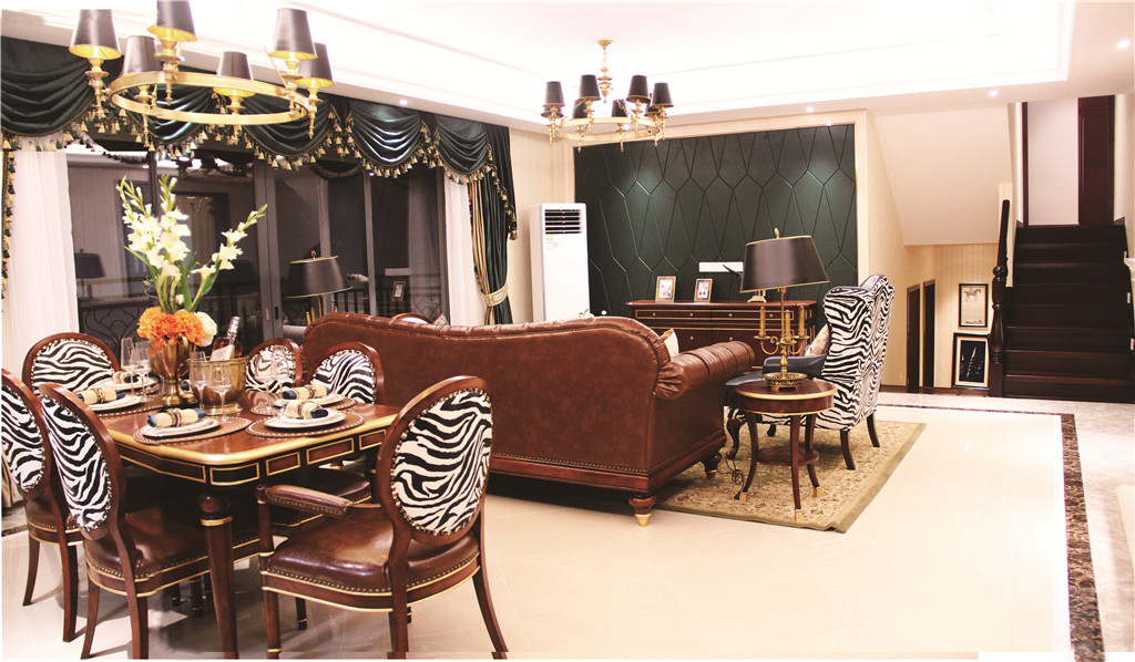 客厅、餐厅:华丽吊灯营造大气且充满温馨感的居家氛围。地面以简约的走线风格,规整且自然,电视背景墙的石材边框,让空间更宽阔,承载全家人的幸福生活。