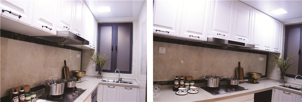 厨房:简约的白色橱柜,与黑色瓷砖相呼应,铸造了熠熠生辉的梦想厨房。每一天袅袅升起的氤氲热气,就是为家人准备美食的温馨时刻。
