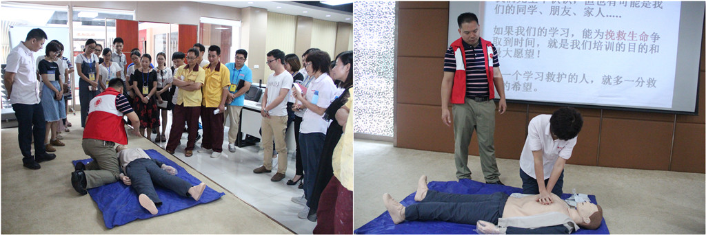 应急救护培训现场:来自红十字会的培训老师用通俗易懂的语言为大家讲解了心肺复苏、人工呼吸等常见应急、意外伤害的救护原理及技术手段,并结合实践操作,让大家掌握基本急救、自救、呼救的技能知识和关键性的救助实践操作,提高面对意外事故的应急能力。
