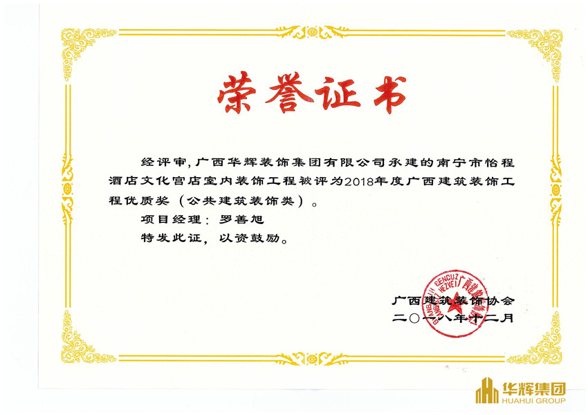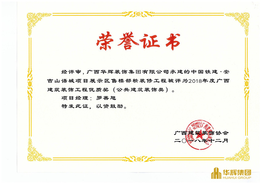 ▲凯发k8官网承建的中国铁建·安吉山语城项目展示区售楼部精装修工程、南宁市怡程酒店文化宫店室内装饰工程荣获“2018年度广西建筑装饰工程优质奖(公共建筑装饰类)