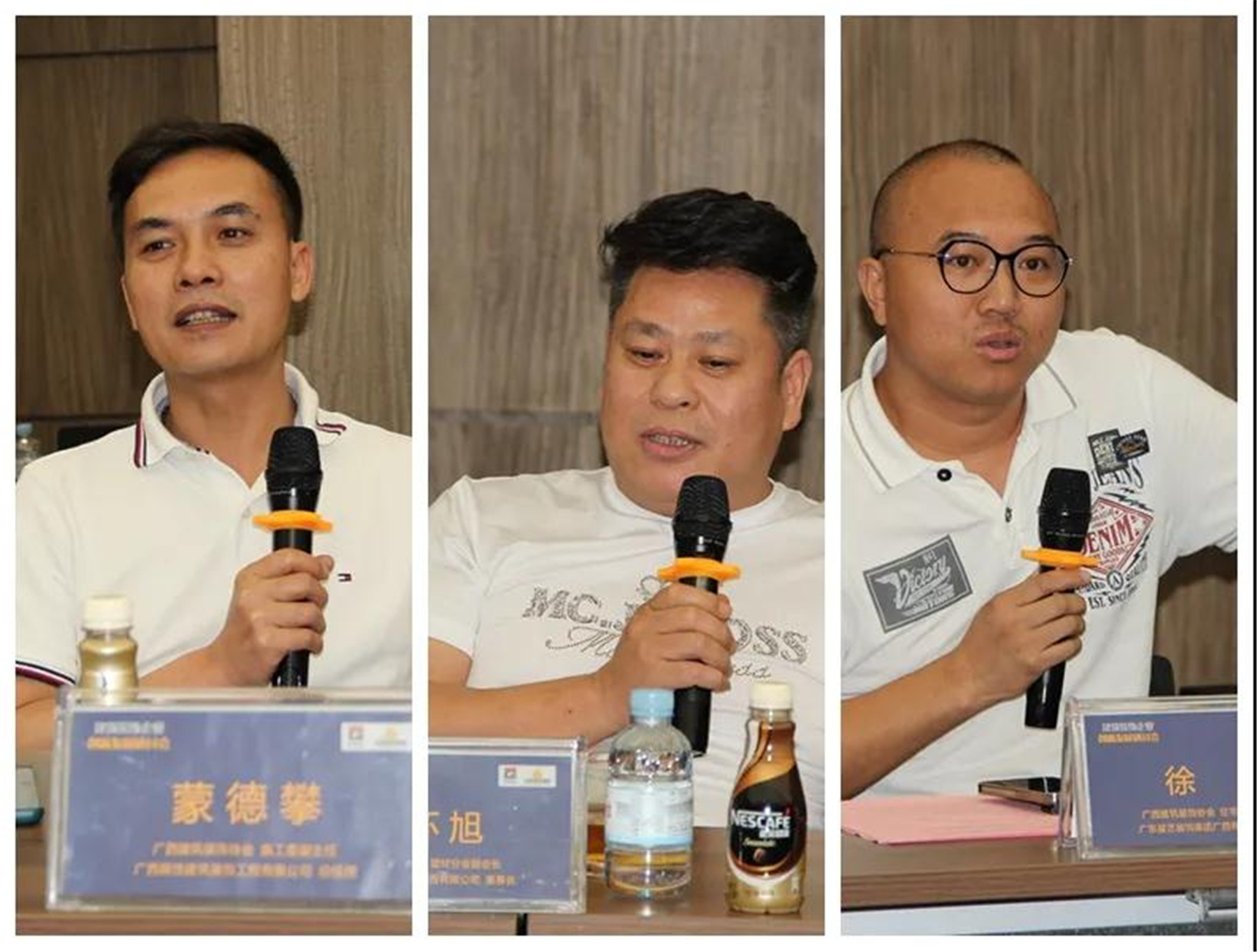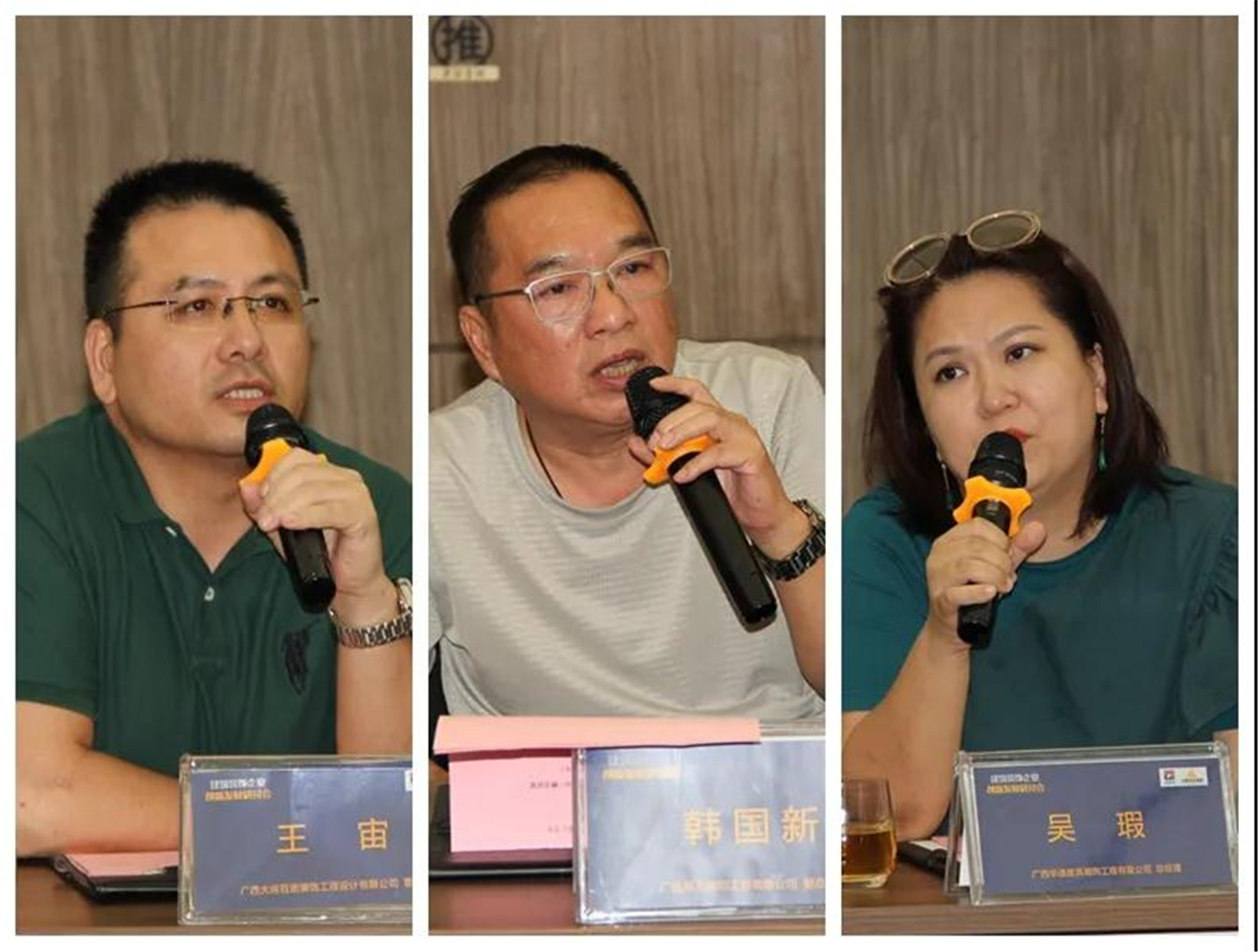 ▲(左)住宅装修分会副会长、广西中庭装饰工程集团有限公司董事长 丁胡,(中)广西渱钰川装饰工程有限公司总经理 李灵,(右)广西建科院建筑装饰工程有限公司总经理 邹诗毅
