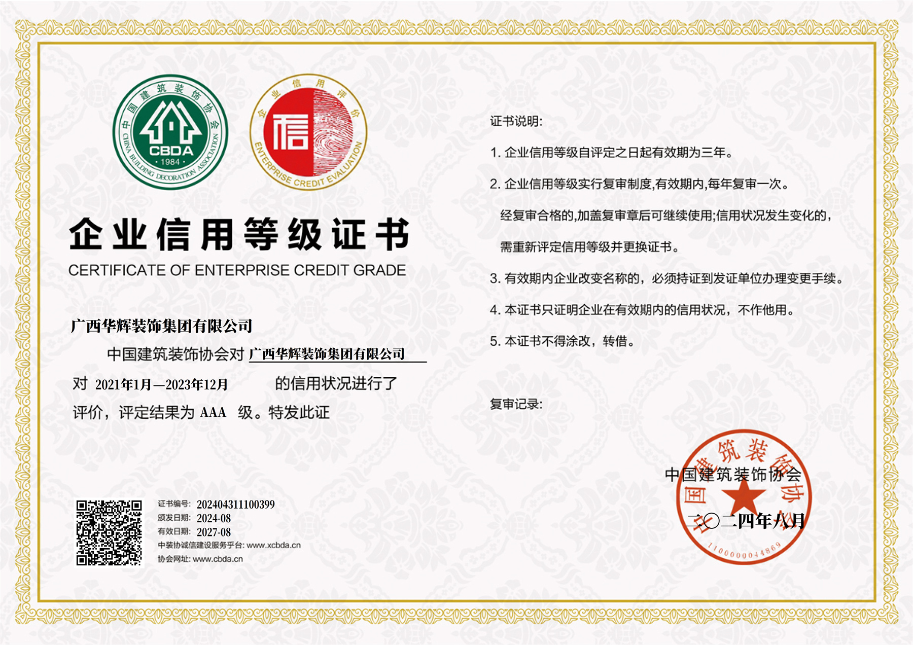 “AAA级信用企业”是中国建筑装饰行业企业主体信用等级评定的最高级别,是对参评企业主体资质、经营管理、财务实力,市场竞争力及信誉度等进行全方位严格考核后的评定,在行业内和社会上具有较高的影响力。