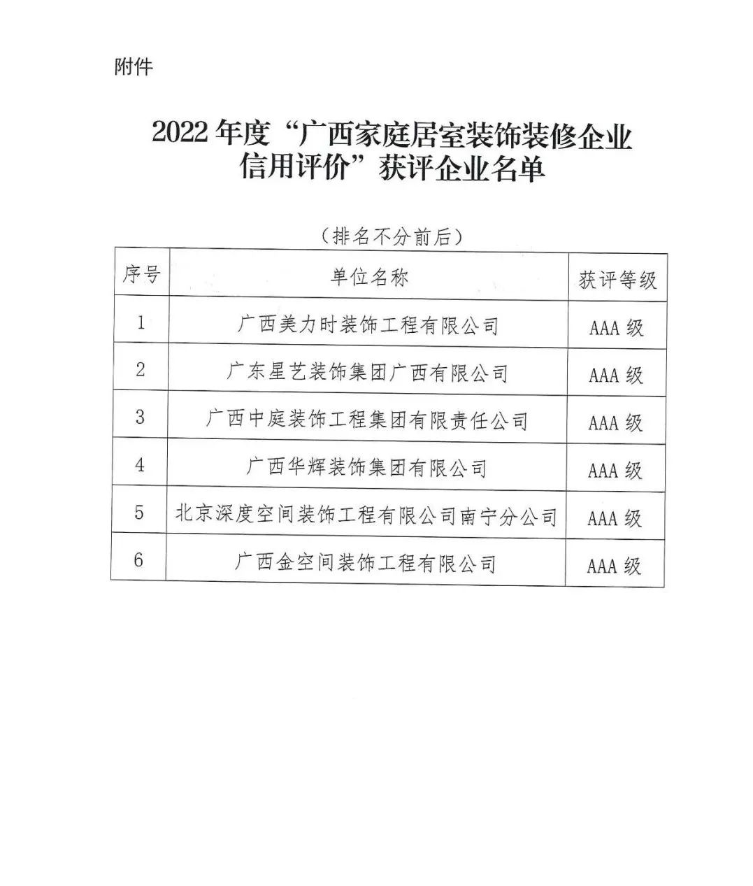 2023年2月2日,广西建筑装饰协会、广西消费者权益保护委员会联合发布通知,评选出符合“广西家庭居室装饰装修企业信用评价”AAA级资格标准的企业共6家,广西凯发k8官网装饰集团有限公司为获评企业之一。